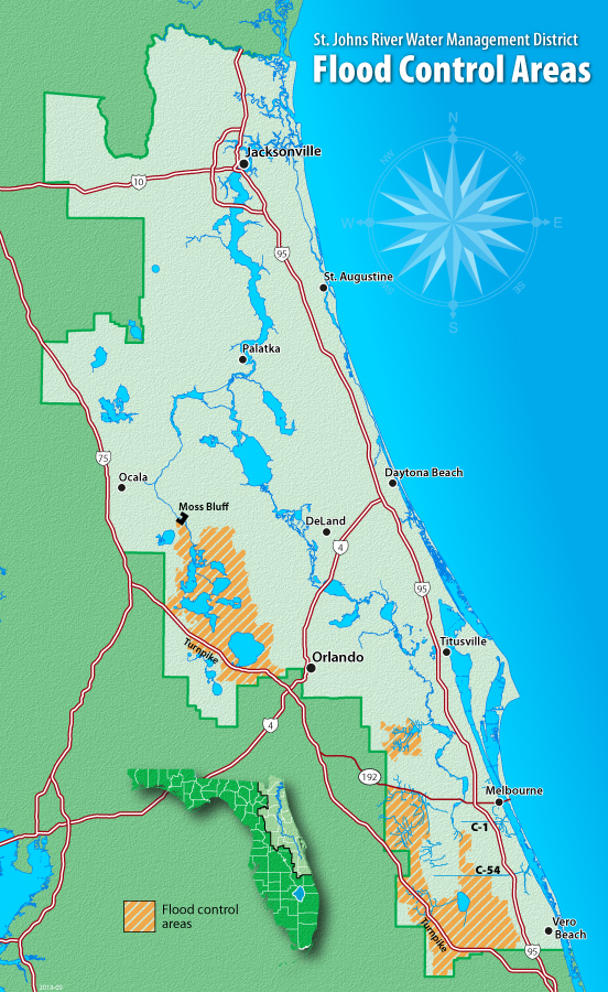 The District is responsible for regulating water use and protecting wetlands, waterways and drinking water supplies in all or part of 18 counties. Counties entirely in the District are Brevard, Clay, Duval, Flagler, Indian River, Nassau, Seminole, St. Johns and Volusia. Counties partially in the District are Alachua, Baker, Bradford, Lake, Marion, Putnam, Okeechobee, Orange and Osceola. (See map)